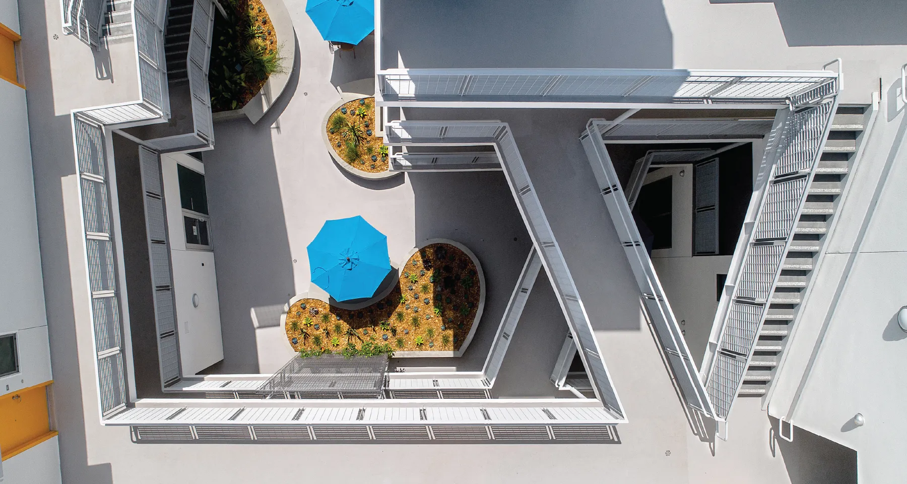 Dwellings have patios or balconies, and exterior walkways and stairs wrap around the courtyard, leading up the high point of the building, a roof deck with a BBQ, seating and eating area, community garden and breathtaking 360° views of the ocean, mountains and downtown Los Angeles.