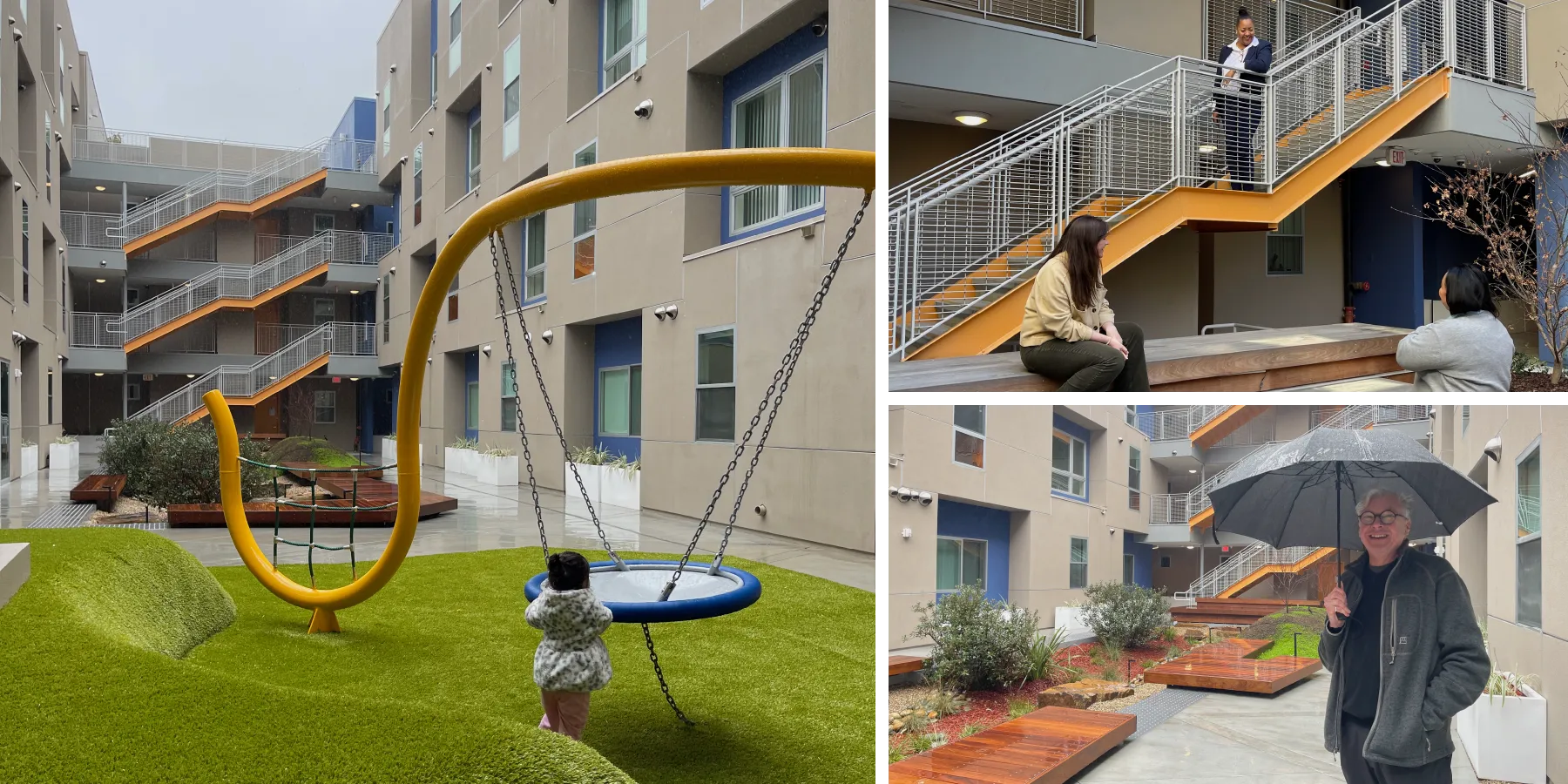 One of the things that’s really great is the play area. There’s a small playground and there’s seating outside, benches and a community room that everyone has access to. I’ve noticed a lot that one parent will stay down in the courtyard and watch the kids play while the others get dinner started, or do whatever. I think it lends itself to more community because you have that space right there and so it feels very safe.