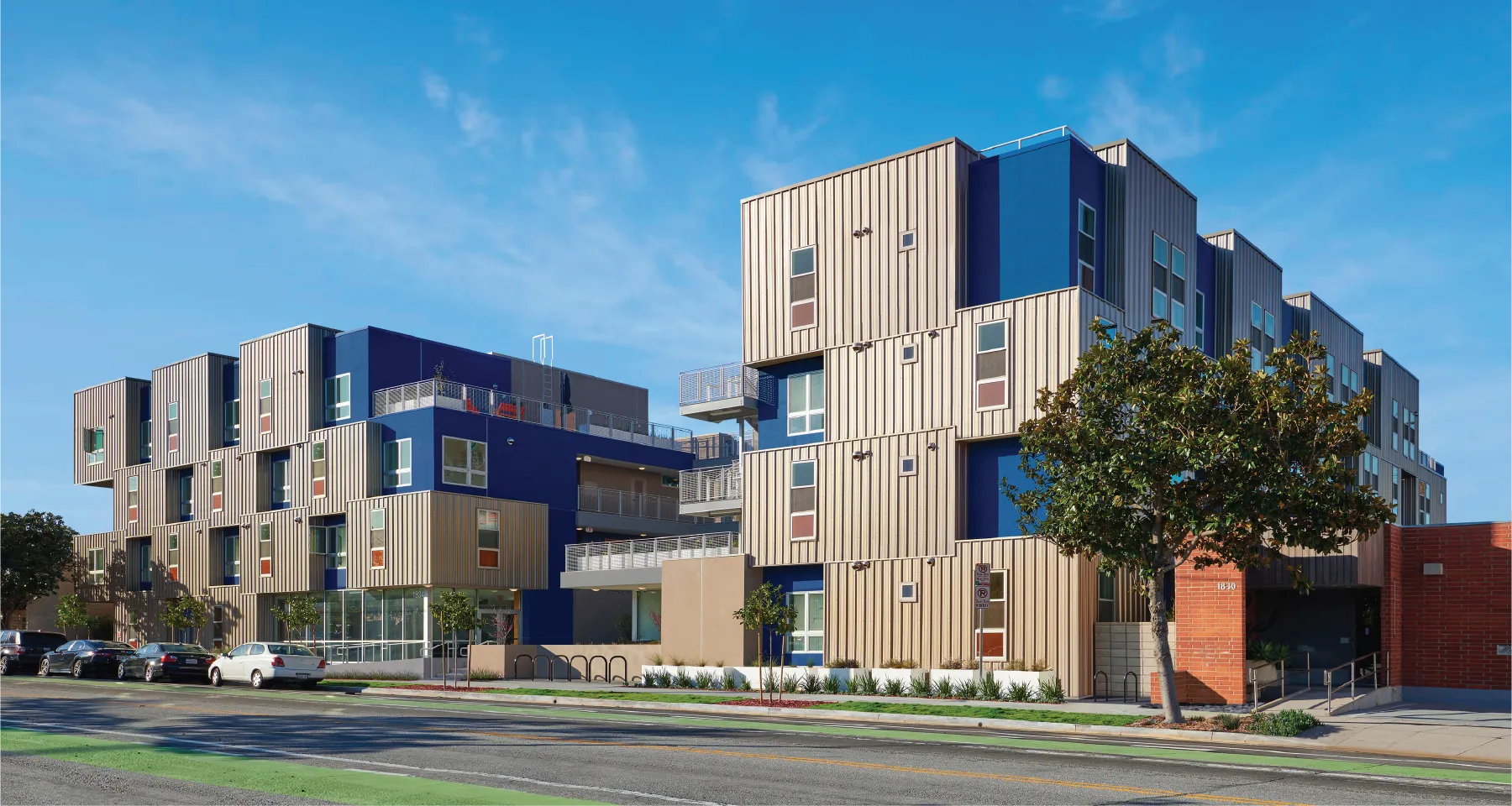 This is strikingly displayed in Las Flores (2023), a 73-unit building aimed at families, next door to Greenway Meadows, for seniors, and built by the same design and development team. The courtyard of the all-electric building goes one further in terms of modeling sustainability (a priority of Community Corporation and the City of Santa Monica), with an artfully designed rain garden with bioswale planting over a cistern where it captures and treats stormwater for irrigation, while giving the residents a taste of nature.