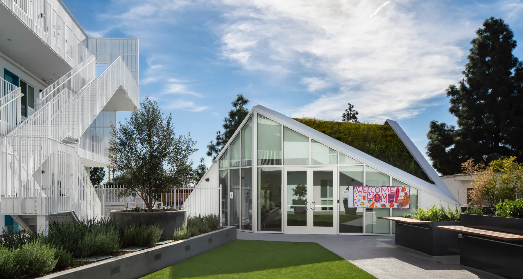 At MLK1101 (2019), LOHA and the nonprofit developer Holos Communities transformed a vacant, unimproved lot in South LA into 26-units for previously homeless veterans and low-income families. They created an L-shaped building around an elevated green patio, or “outdoor living room”, allowing every apartment to receive sunlight and cross ventilation, and for residents to relax and socialize away from the noise of the street.