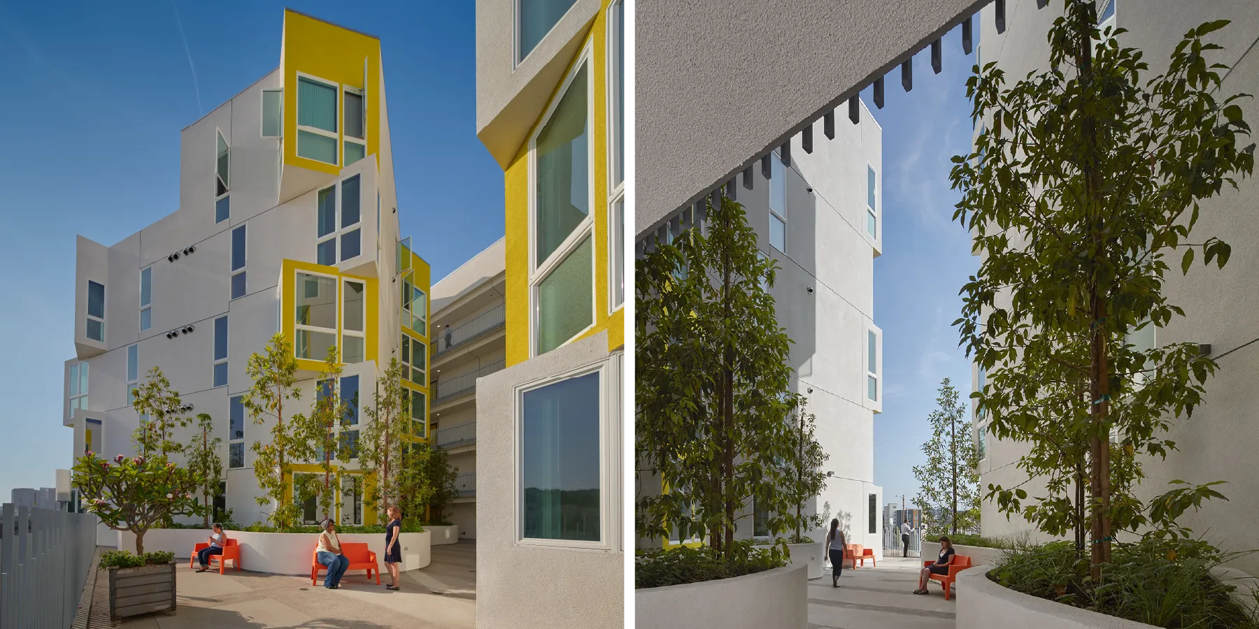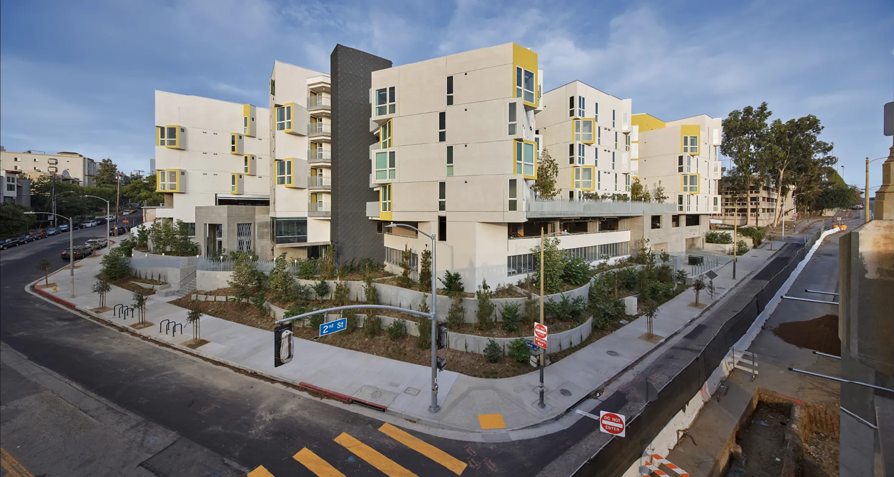 Mosaic Gardens at Westlake (2018) is a 125-unit affordable apartment building for families, seniors and for formerly homeless people, in two separate towers on a three-story podium. The site is on a very steep corner at a busy intersection but the design takes advantage of the dramatic topography to give each unit a unique view, scanning from downtown LA to the Hollywood Hills.