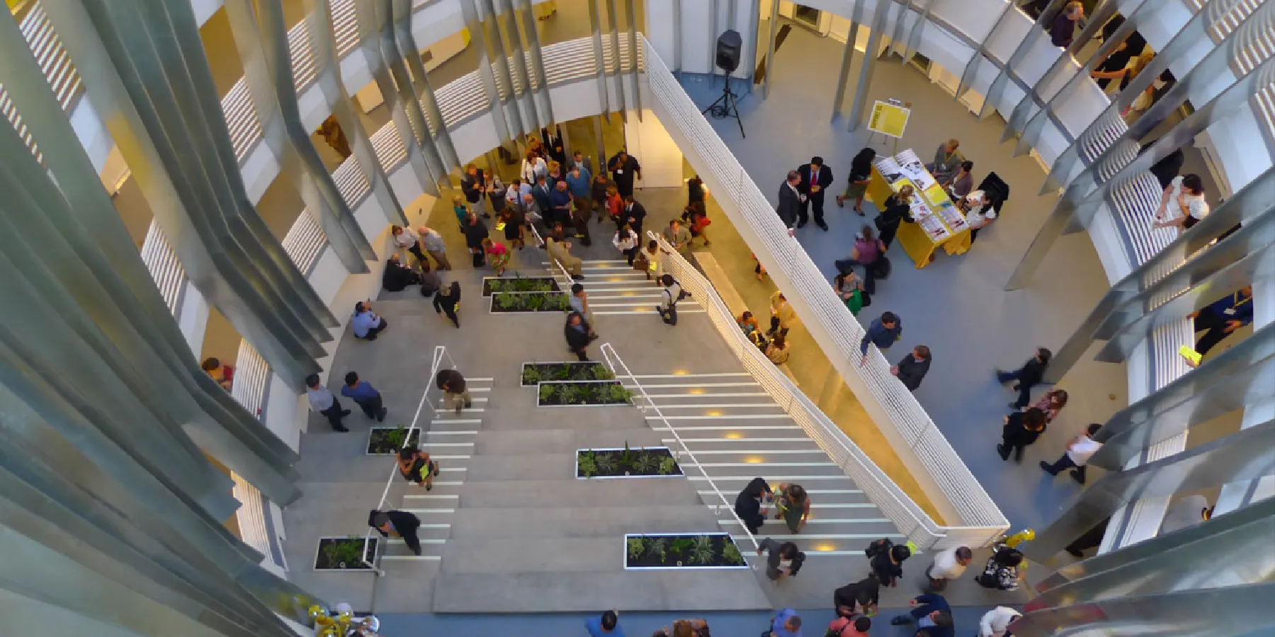 So the team created a six-story circular form, with facets on the facade that position windows obliquely to the direction of sound, and create a play of light and shadow on the exterior. The residential experience is focused inward, into a light-filled open courtyard with a broad staircase, A series of vertical fins line the inner edge of the central space, and serve as structural support, privacy screens for tenants, and ventilation risers for methane gas.