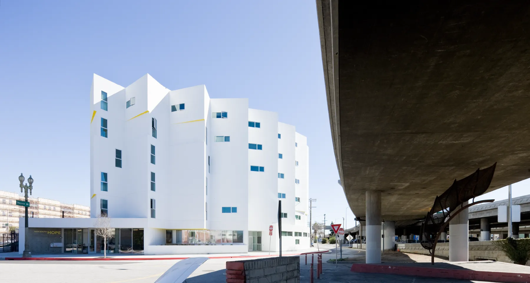 The firm describes its practice as “rooted in a deep belief in architecture’s capacity to create new physical, cultural, and social connections, and the firm’s groundbreaking work is often located in challenging locations.” New Carver Apartments, 97 units of permanent supportive housing, occupies an extremely challenging location, in downtown Los Angeles beside the 14-lane, 10 freeway.