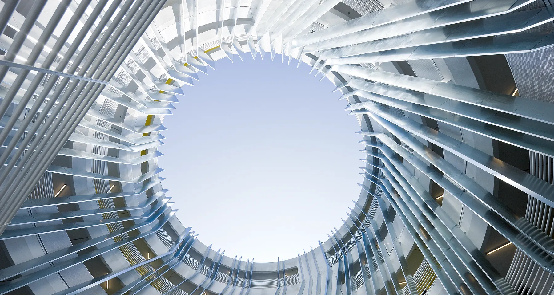 So the team created a six-story circular form, with facets on the facade that position windows obliquely to the direction of sound, and create a play of light and shadow on the exterior. The residential experience is focused inward, into a light-filled open courtyard with a broad staircase, A series of vertical fins line the inner edge of the central space, and serve as structural support, privacy screens for tenants, and ventilation risers for methane gas.