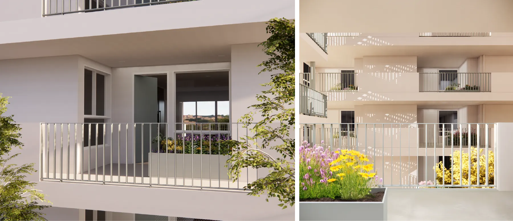 Clockwise from top: Ramsgate Avenue Apartments, façade and porch spaces. Renderings by Wyota Workshop.