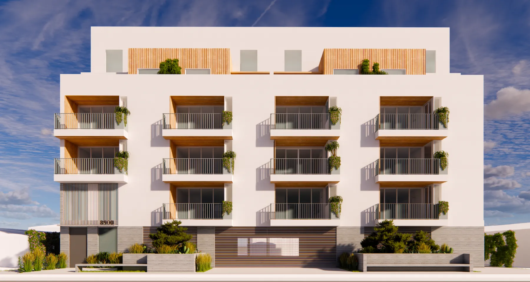 Ramsgate Apartments (2025) consists of two five story blocks that sit on a landscaped podium (one or two levels of concrete containing ground level uses like retail or parking) and surround a courtyard. The roof terrace provides community space with views of the city, mountains and ocean.