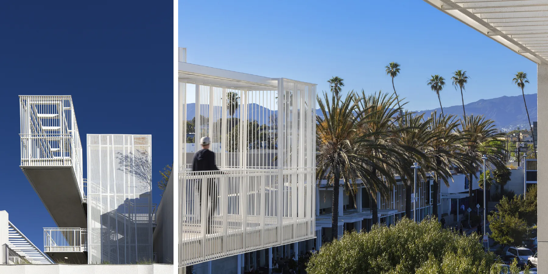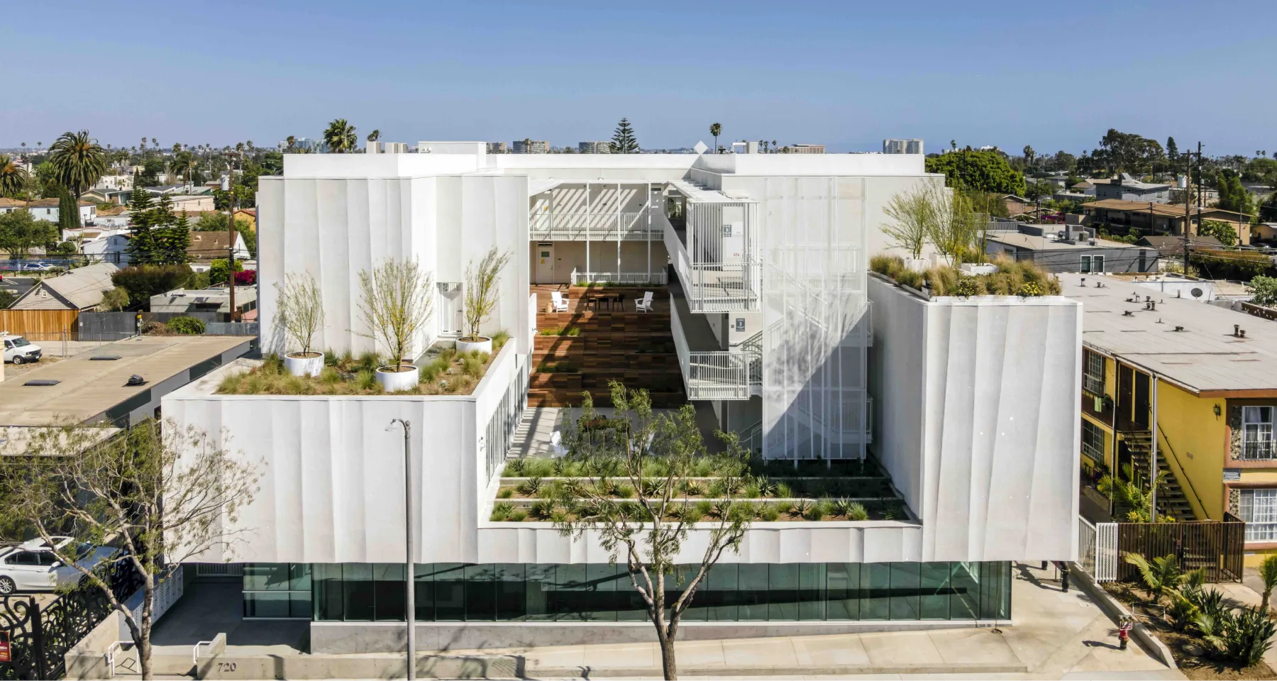 This approach is modeled in Rose Apartments (2022), a very distinctive, four-story, building containing 35, 100% affordable dwellings for a mix of young people who have transitioned out of foster care, and people who had been unhoused. It is over ground level offices on Rose Avenue leading to the beach in Venice, not far from Horatio West Court, a beloved courtyard complex built in 1919 by the founding modernist Irving Gill.