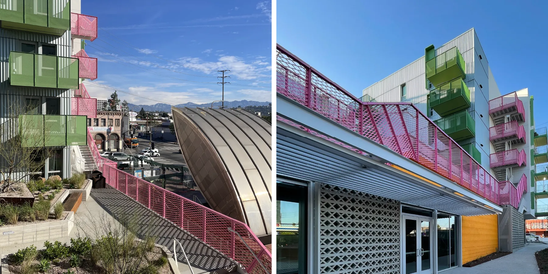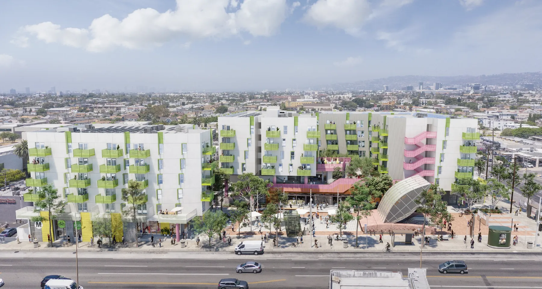 One of the projects to emerge from this program is Santa Monica Vermont (2025) in East Hollywood, Los Angeles, comprising 187 affordable studios and one, two and three-bedroom units on five levels, on land owned by the nonprofit Little Tokyo Service Center (LTSC), surrounding the Santa Monica/Vermont subway station.