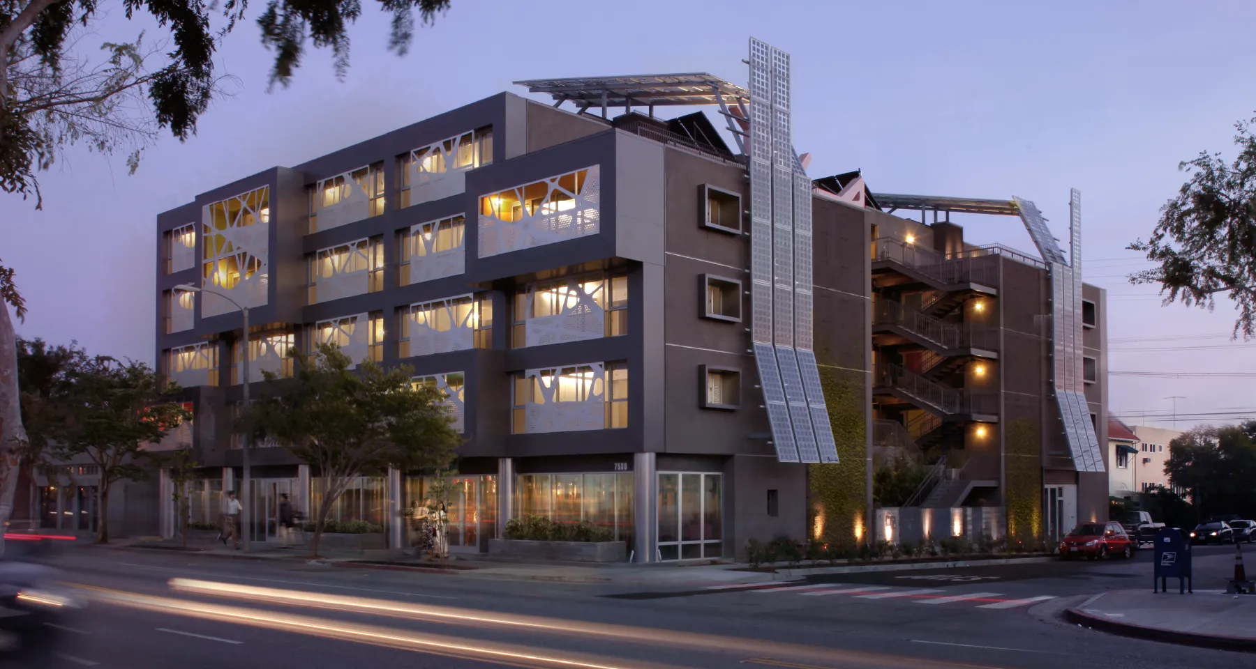 The apartments are arranged around a central, secluded courtyard, while commercial and retail spaces on the ground level face out onto the busy Santa Monica Boulevard. Each apartment has a private front porch overlooking the courtyard garden, facilitating social interaction among the residents. The capper is a rooftop deck, shaded by its solar powering trellis while facing a phenomenal view of the Hollywood Hills.