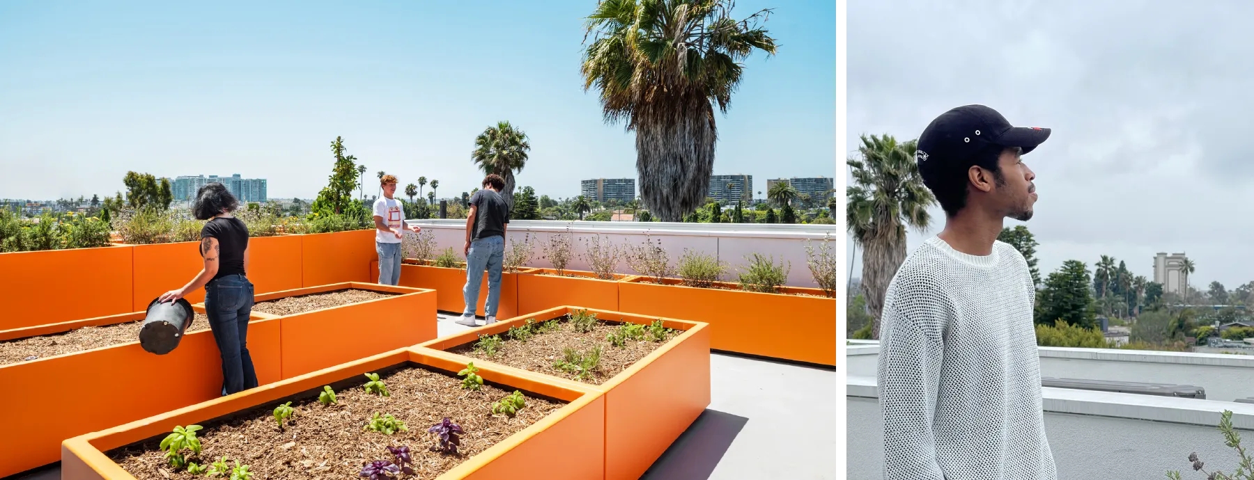 Top: The Journey, façade. Photo by Paul Vu/Here and Now Agency; Bottom left, roof terrace at The Journey. Photo by Paul Vu/Here and Now Agency; Bottom right, Anthony, a resident at The Journey. Photo by Frances Anderton.
