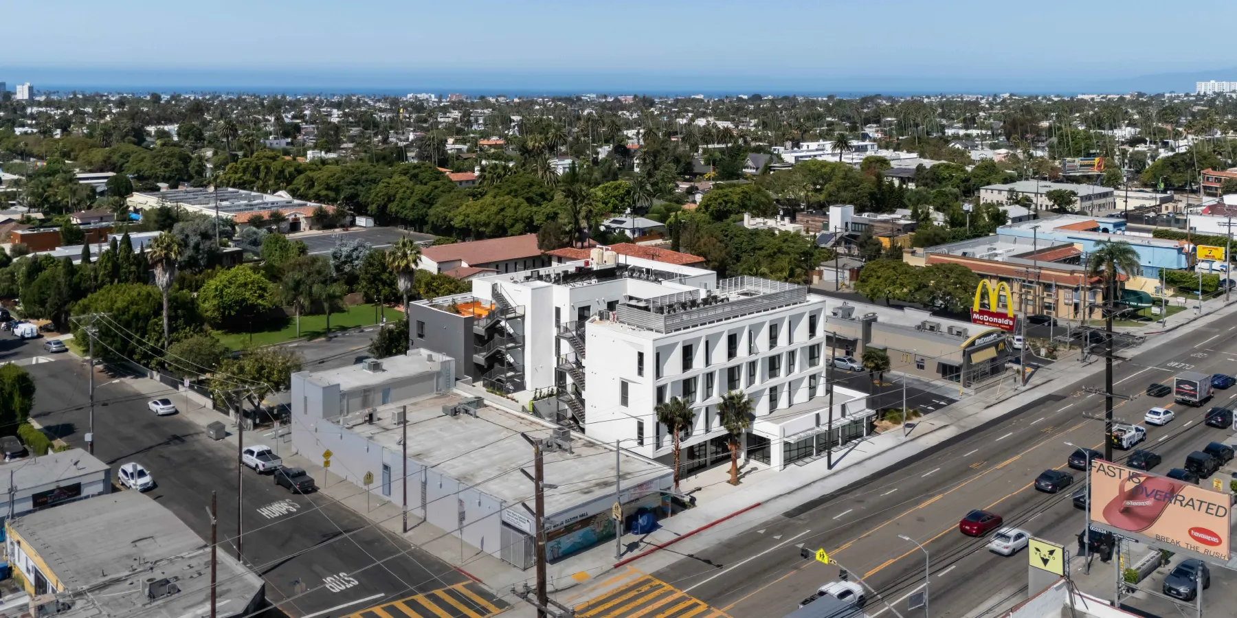 The building is on the East-facing side of Lincoln Boulevard, a multi-lane thoroughfare that is noisy, polluted and unsafe for pedestrians. So the design and development took advantage of the bounty to the West: the ocean, the horizon and LA sunsets. They also met with resistance to the project from a neighboring church.
