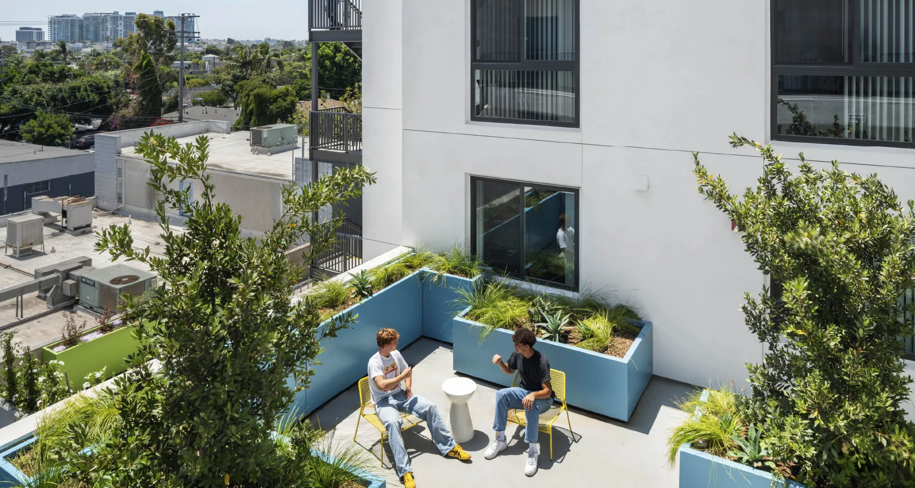 Studio One Eleven is based in Long Beach, where it is playing a central role in the area’s downtown revival. The Journey (2024), in Venice, is a 100% affordable, supportive housing complex for young people transitioning out of foster care, some families and some people who had been living on the streets. The dwellings are above a service center on the ground floor, Safe Place for Youth (SPY).